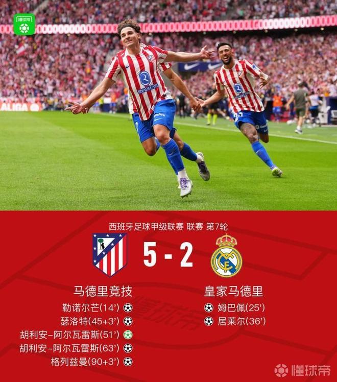 馬德里競技勒諾爾芒率先頭球破門,居萊爾助攻姆巴佩扳平,隨后居萊爾抽射反超比分。上半場補(bǔ)時階段瑟洛特絕平。下半場,胡利安-阿爾瓦雷斯點(diǎn)射+任意球破門完成梅開二度,格列茲曼比賽最后時刻破門。最終比分馬競 5-2 皇馬。皇馬吞下許久未見的五粒丟球。馬競和西蒙尼救贖了這個賽季,也救贖了自己。而西蒙尼的帥位由此徹底穩(wěn)固。