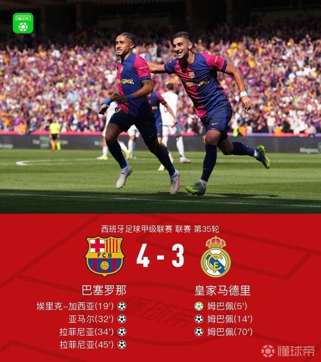 比賽中,皇家馬德里的姆巴佩表現(xiàn)出色,通過點(diǎn)球首開紀(jì)錄后又連入兩球,完成帽子戲法。巴塞羅那方面,埃里克-加西亞率先為球隊(duì)扳回一城,隨后亞馬爾建功將比分追平。拉菲尼亞則在比賽中梅開二度,為巴塞羅那鎖定勝局。最終,巴塞羅那以4-3戰(zhàn)勝皇家馬德里,全賽季四殺皇馬。